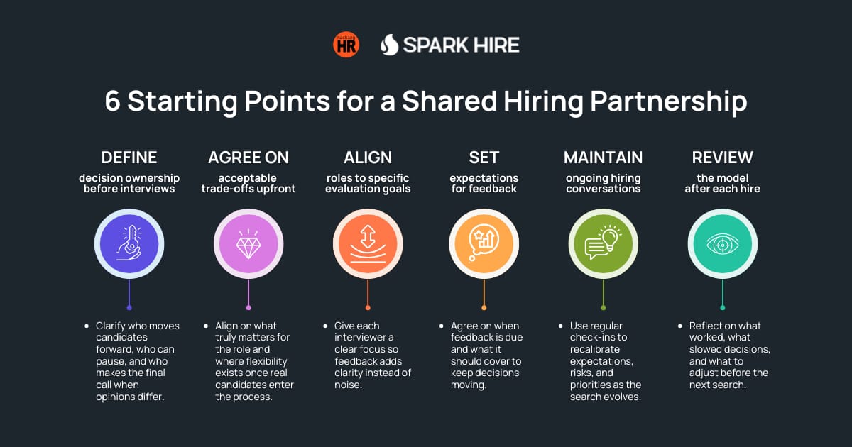 A shared hiring model depends on how Talent Acquisition and Hiring Managers work together. In a partnership, both sides share responsibility for decisions, outcomes, and trade-offs throughout the hiring process.