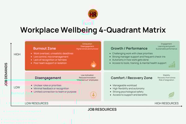 A practical matrix to understand how job demands and resources shape burnout, disengagement, and performance.